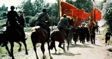 Mot slutet händer en grej som jag inte fattade poängen med. Det hade kunnat finnas en poäng men den blir aldrig tydlig. Det kommer ett telegram till företagarna från jag tror det var Länsstyrelsen där det sägs att man inte får använda de inhyrda arbetarna (strejkbrytarna i de strejkandes ögon). Om de strejkande marscherande arbetarna hade fått reda på detta så kanske tragedin hade kunnat hindras. Och det kanske var det som var syftet med scenen men det nämndes liksom aldrig igen.
