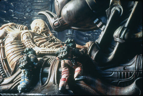 Det där skeppet man hittar på planeten. Oj, vad det väckte tankar! Hur länge hade det legat där? Vad hade hänt? Man får inte veta nånting i princip. Space Jockey, man såg faktiskt att han hade snabel även i Alien precis som det sägs att han ska ha i Prometheus som tydligen utspelas ett gäng år tidigare. Fast är det en snabel? Det kanske är en syrgasslang eller en Alien i sin facehugger/spindel-form? Hur som helst, det är riktigt snygg design i dessa scener. Innandömet av skeppet var som att vara inne i en jättelik larv.